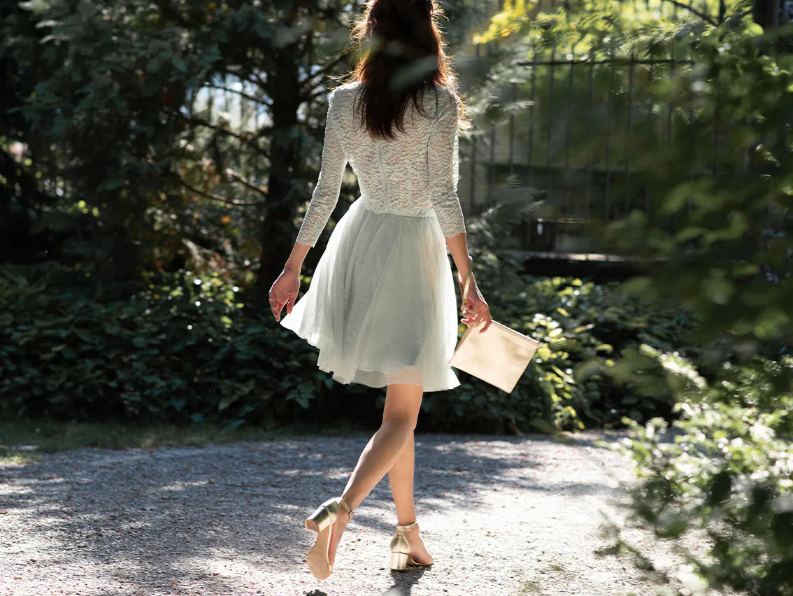 Wir empfehlen dir, etwa 3–4 Wochen vor deiner Hochzeit bei uns im Showroom in Zürich vorbeizuschauen. Dann können wir dich persönlich bezüglich der passenden Grösse beraten und diese optimal für deinen besonderen Tag einschätzen.